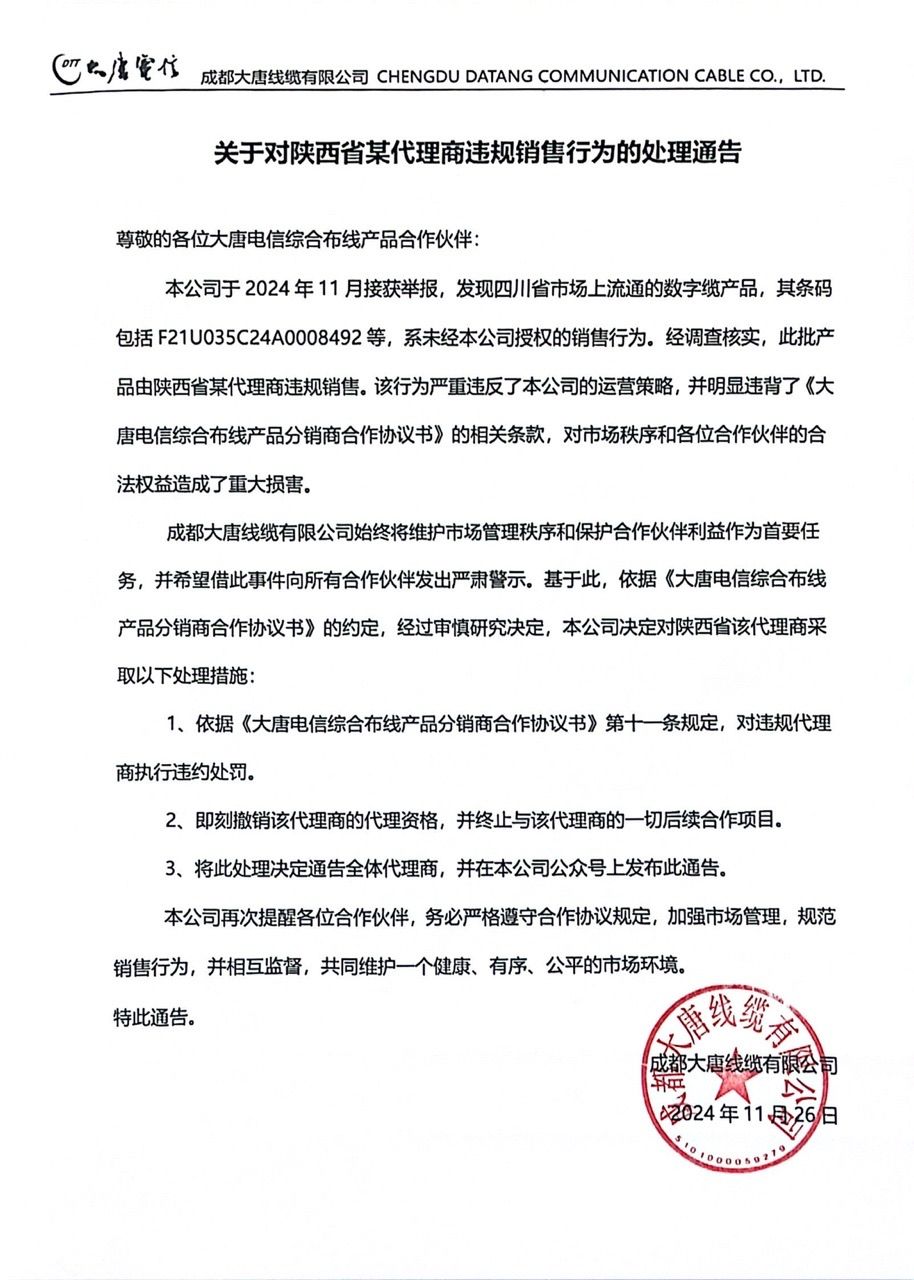 关于对陕西省某代理商违规销售行为的处理通告